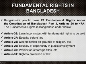 The fundamental rights of the people of Bangladesh have been guaranteed in Part III (Article 26-44) of the constitution of Bangladesh.All past laws inconsistent with these rights are made void by the Constitution, and it directs the State not to make any law inconsistent with these rights. Article 44 of the constitution guarantees the right of every citizen to move the High Court Division in accordance with clause (1) of Article 102 for the enforcement of any of the fundamental rights conferred by Part III of the Constitution.[1] The jurisdiction of the High Court Division of the Supreme Court to enforce the fundamental rights is defined in Article 102 of Part Vl of the Constitution of 1972.