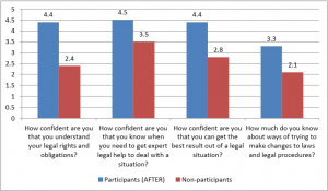 For 12 of the 13 legal capability indicators, the average responses from the nonparticipants are similar to the average before responses of the participants. The exception is for indictor 8 which asks how well the respondent has dealt with law related issues that they have experienced in the past. On this indicator, the average rating from the non-participants is significantly lower than the average before rating of the participants. This difference is explained by the bias towards higher ratings for the participant group from the Paiwand participants, as discussed above. In general, then, the average responses from the non participants are very similar to the average before responses from the participants. That is, all those who completed a questionnaire at a time when they had not taken part in PLE showed the same levels of legal capability on virtually all indicators. Comparing the non-participants responses to the after responses of participants shows that the legal capability of participants was significantly higher. The comparisons for key indicators are shown in the charts below. These illustrate that people who took part in the PLE courses are more confident that they understand their legal rights and obligations, that they know when to get expert legal help, and that they can get the best results out of a legal situation.